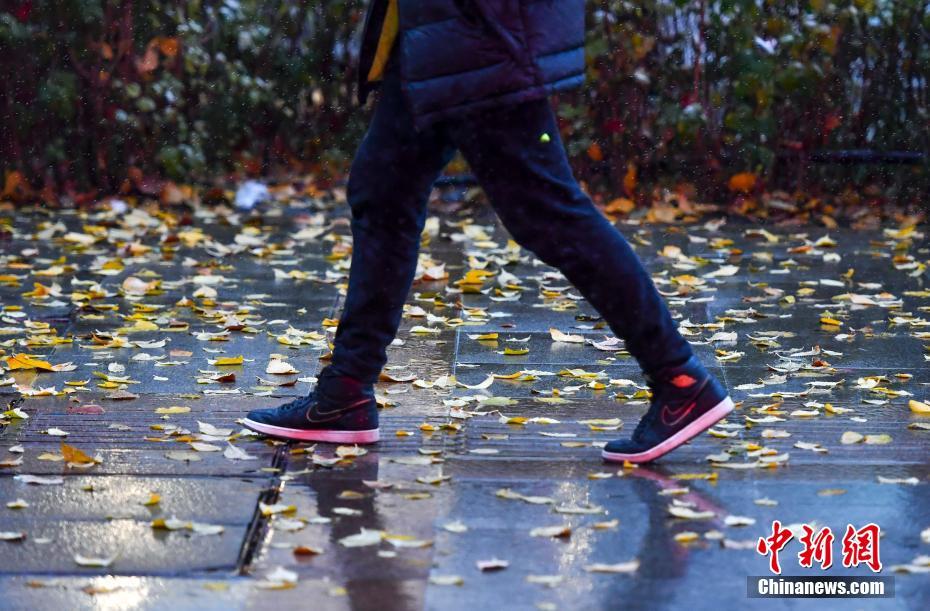 11月1日,新疆乌鲁木齐市街头,市民从满地黄叶上走过。10月31日16时27分,乌鲁木齐市气象台发布了入秋后首个寒潮预警:预计未来48小时内,该市各区最低气温将下降8摄氏度以上,大部区域伴有雨雪和5级西北阵风,城区2至3日最低气温零下7℃左右,建议防范。中新社记者 刘新 摄