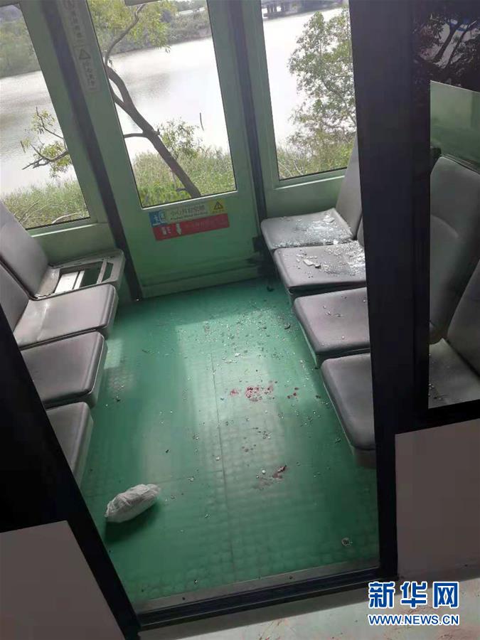 这是游客拍摄的发生事故后的“欢乐干线”车厢(11月1日摄)。 记者从深圳华侨城欢乐谷旅游公司获悉,1日上午11时许,该欢乐谷“欢乐干线”高空观光列车在运行过程中发生车辆追尾事件,导致2名乘客受伤。 新华社发
