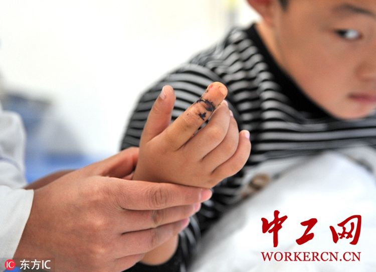 2018年11月2日上午,在西安市红会医院手外科一病区,记者看到欧学海副主任和护士正在给鹏鹏(化名)移植后的食指换药,脚趾移植到食指断裂处“移位缝合”的伤口基本已经长好。脚趾移植到食指上后,新食指看上去和没“咬掉”以前没啥区别了。(图片来源东方IC,请勿转载)