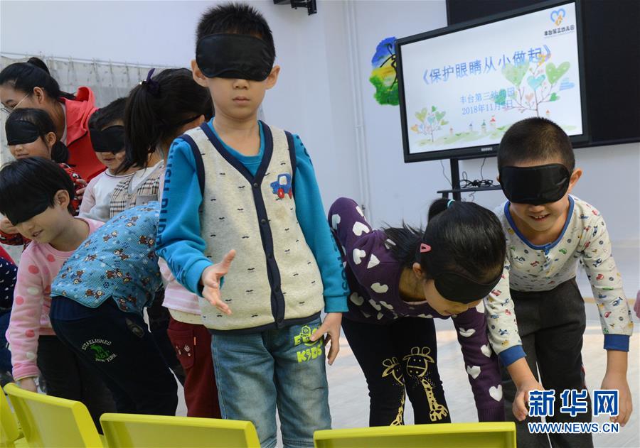 11月2日,北京市丰台第三幼儿园的小朋友在参加“体验盲走”游戏。 当日,北京市丰台第三幼儿园举办“保护眼睛从小做起”主题活动,引导孩子们从小养成爱眼护眼的好习惯。 新华社发(章建华 摄)