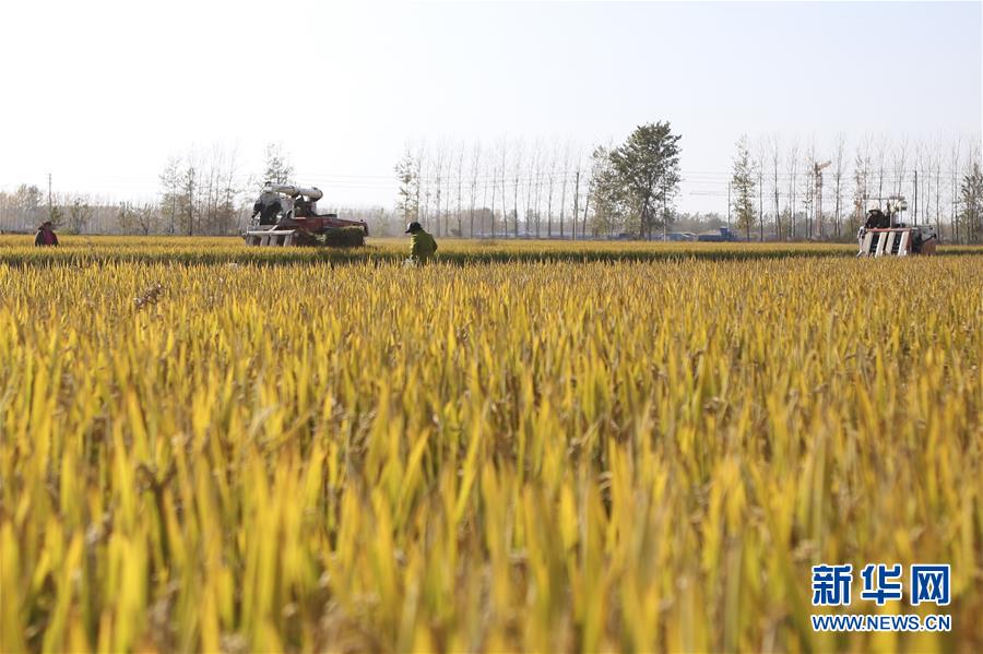 11月2日,江苏省淮安市洪泽区高良涧街道农民在收割水稻。当下正值秋季最忙碌的时节,金色大地一派丰收景象。 新华社发(万震 摄)