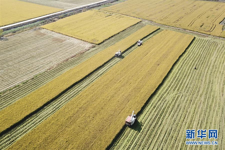 11月2日,江苏省淮安市洪泽区高良涧街道农民在收割水稻(无人机拍摄)。当下正值秋季最忙碌的时节,金色大地一派丰收景象。 新华社发(万震 摄)