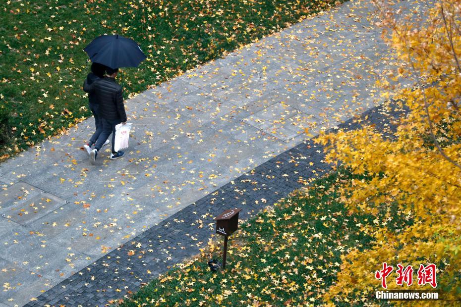11月4日,北京行人从落满树叶的小路经过。当日,北京阴有小雨,山区雨夹雪或雪,阵风六级。受冷空气影响,北京白天最高气温11℃,夜间最低气温2℃,气温下降明显,风寒效应显著。 中新社记者 刘关关 摄