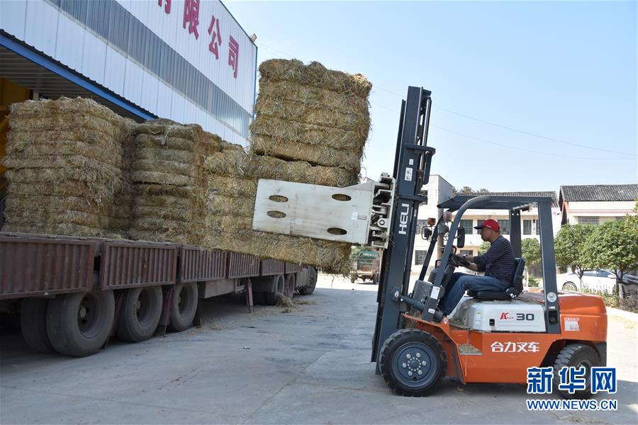衡阳县农民在“打包中心”将秸秆压缩、捆扎成大包后装上大货车,准备运往板材工厂(11月2日摄)。 秋高气爽,稻浪金黄,湖南省的晚稻到了丰收时节。记者近日在粮食生产大县衡阳县采访时,却没有看到以往常见的、白烟滚滚的稻草秸秆焚烧景象,取而代之的是一种收割秸秆的“新式武器”。 新华社记者 白田田 摄