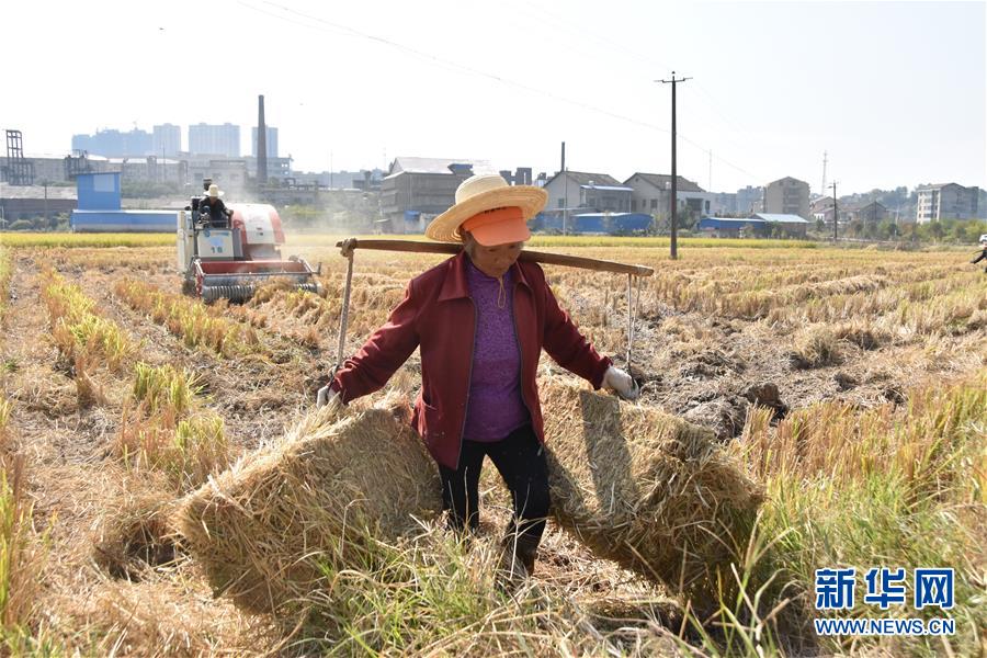 衡阳县农民将打捆后的“秸秆包”从田间挑到路边(11月2日摄)。 秋高气爽,稻浪金黄,湖南省的晚稻到了丰收时节。记者近日在粮食生产大县衡阳县采访时,却没有看到以往常见的、白烟滚滚的稻草秸秆焚烧景象,取而代之的是一种收割秸秆的“新式武器”。 新华社记者 白田田 摄