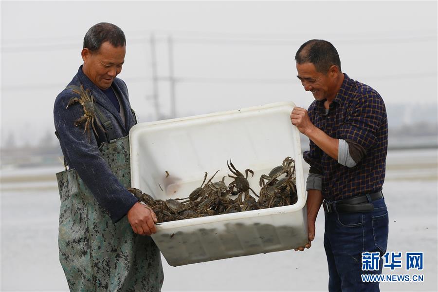 11月4日,江苏省泗洪县石集乡一家水产公司的工人在捕捞螃蟹。 深秋蟹肥,江苏省泗洪县养殖的螃蟹大规模供应市场。泗洪县位于洪泽湖西岸,淮河下游,水产资源丰富。 新华社发(许昌亮 摄)