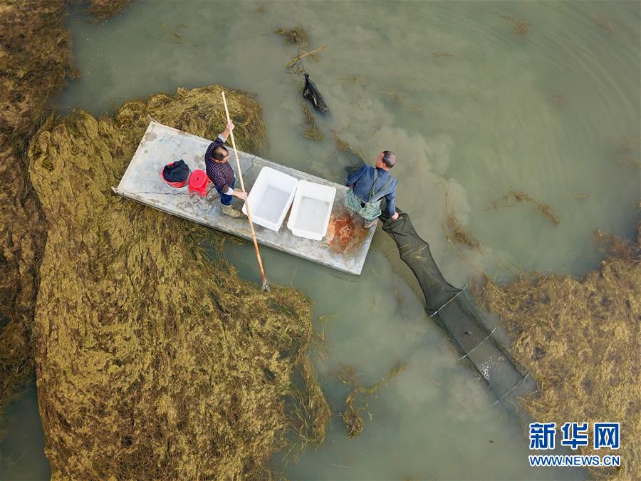 11月4日,江苏省泗洪县石集乡一家水产公司的工人在捕捞螃蟹(无人机拍摄)。 深秋蟹肥,江苏省泗洪县养殖的螃蟹大规模供应市场。泗洪县位于洪泽湖西岸,淮河下游,水产资源丰富。 新华社发(许昌亮 摄)