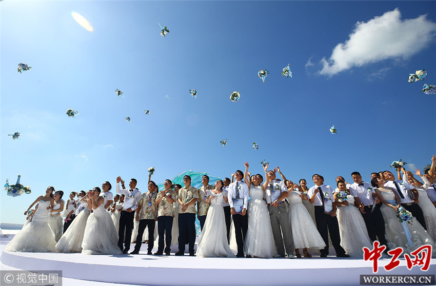 2018年11月6日,海南三亚,新婚、纪念婚夫妇在海南省三亚市天涯海角参加婚庆节。图片作者:不二/视觉中国
