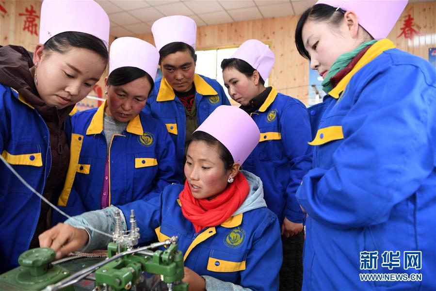 11月6日,在东乡族自治县大树乡“扶贫车间”,留守妇女向熟练工(中)学习操作技巧。