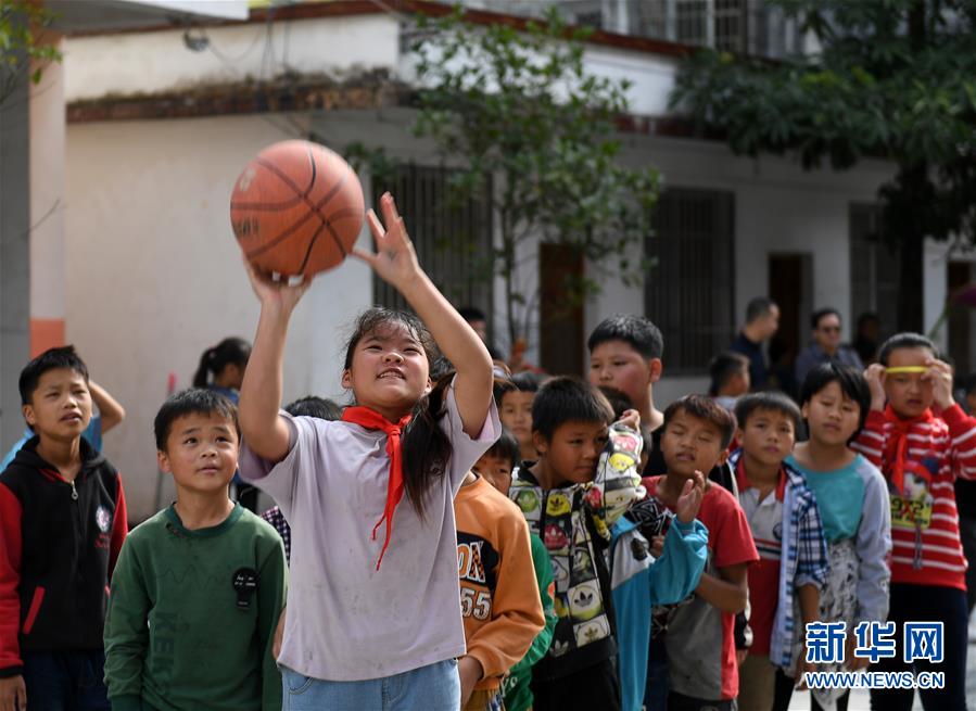 11月6日,广西都安瑶族自治县下坳镇隆麻小学的学生在课间打篮球。