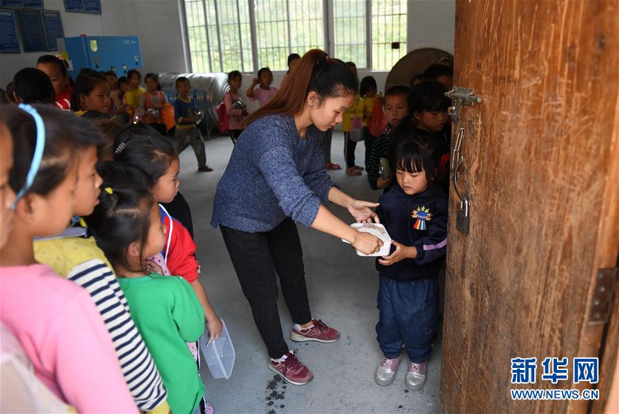 11月6日,广西都安瑶族自治县下坳镇隆麻小学的老师在帮助学生领取营养午餐。