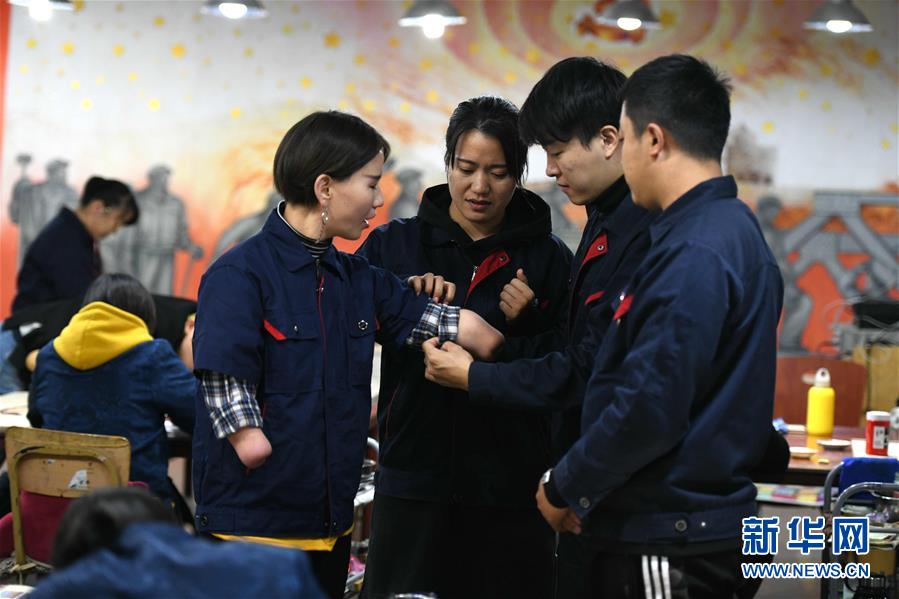11月6日,在河北石家庄百年巧匠木绘艺术工坊内,同事正在帮助玛达娜·达木(右四)挽衣袖。新华社发(陈其保 摄)