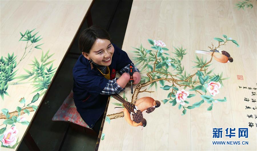 11月6日,在河北石家庄百年巧匠木绘艺术工坊内,玛达娜·达木正在介绍她的绘画作品。新华社发(陈其保 摄)