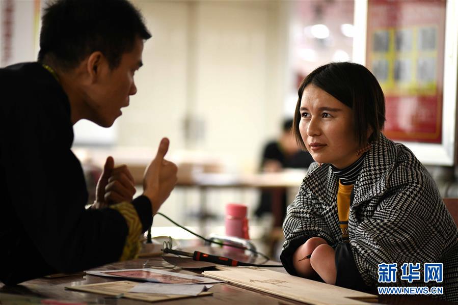 11月6日,在河北石家庄百年巧匠木绘艺术工坊内,玛达娜·达木(右)正在与同事交流。新华社发(陈其保 摄)