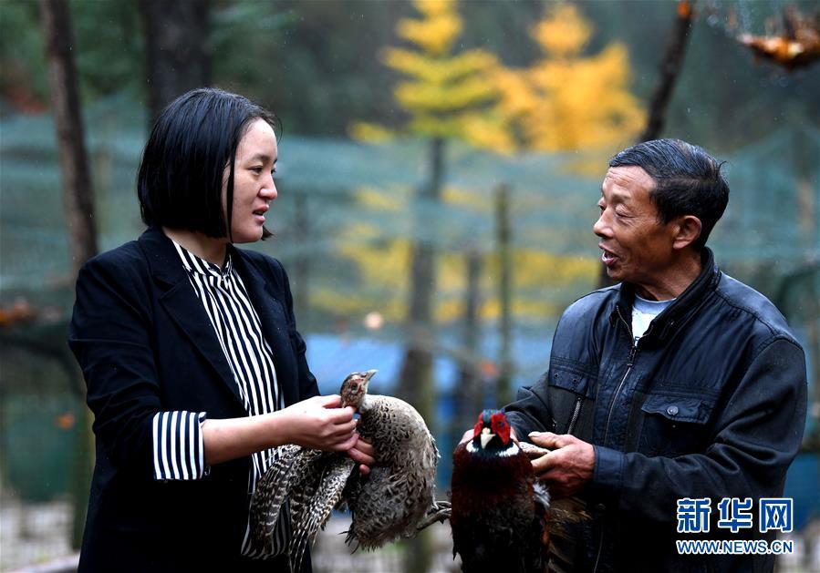 11月7日,余纯(左)在岳西县田头乡的山鸡养殖场与养殖场员工交流。