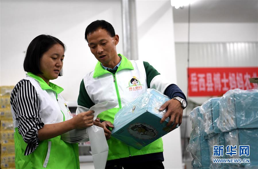11月7日,余纯(左)在岳西县电商产业园的仓库与合伙人一起备货。新华社记者张端摄