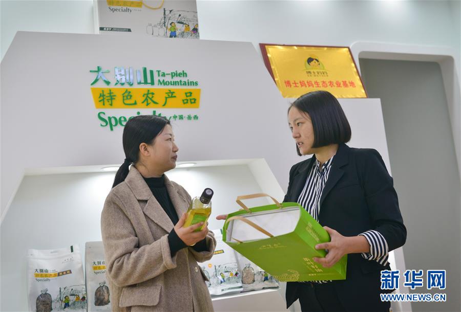 11月7日,余纯(右)在岳西县田头乡的一家农产品合作企业洽谈农产品采购。新华社记者李任滋摄