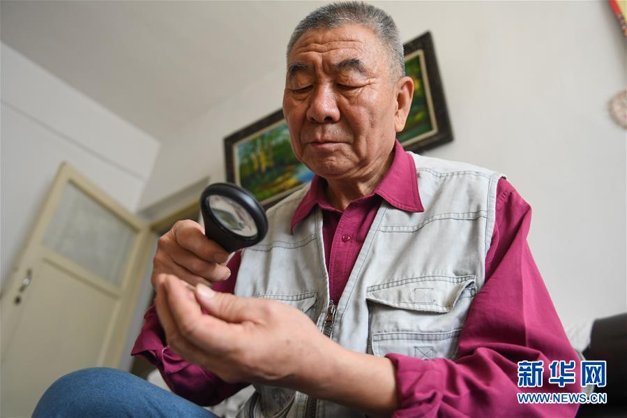 10月15日,刘振起用放大镜欣赏与铁路有关的纪念章。 新华社记者 彭源 摄