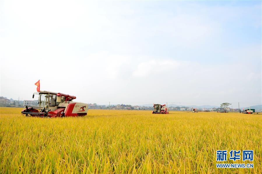 11月9日,在湖南省双峰县梓门桥镇八仙村千亩双季稻种植示范基地,梓金农机专业合作社的社员驾驶收割机在抢收晚稻。 新华社发(李建新 摄)