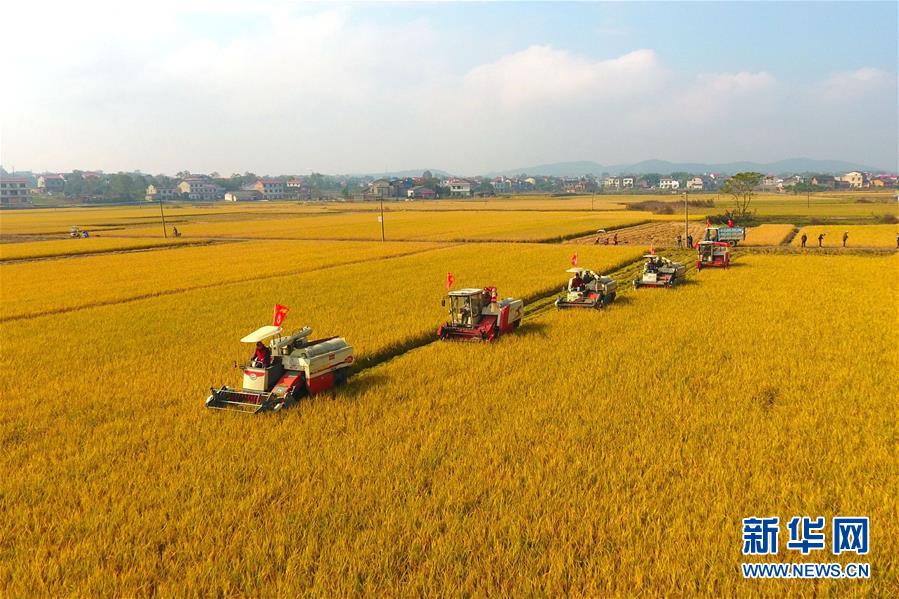 湖南双峰:农机合作社收割机集团作业抢收晚稻