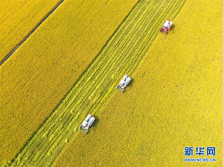 11月9日,在湖南省双峰县梓门桥镇八仙村千亩双季稻种植示范基地,梓金农机专业合作社的社员驾驶收割机在抢收晚稻(无人机拍摄)。 新华社发(李建新 摄)