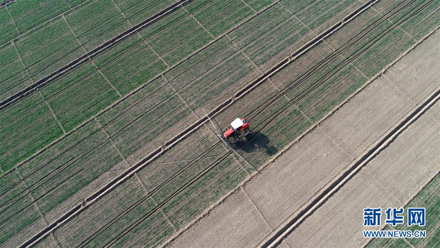 11月9日,在石家庄市藁城区梅花村的麦田里,一家农机种植专业合作社的社员驾驶农机为麦苗喷药除草(无人机拍摄)。 新华社发(梁子栋 摄)
