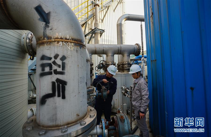 11月9日,在泰兴一家沼气发电企业,技术人员在沼气脱硫净化设备旁作业。新华社记者 季春鹏 摄