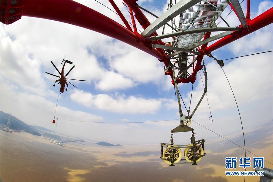 11月9日,直升机进行跨海放索作业。 当日,一架直升机从浙江省舟山市定海区册子岛海边升空,牵引着用于输电线架设的钢丝绳飞跃西堠门航道,顺利导入西堠门大跨高塔架线滑轮,这标志着舟山500千伏联网输变电工程西堠门大跨越段开始架线作业。 西堠门大跨高塔坐落在舟山金塘岛和册子岛,全高380米,跨越距离2656米,创下输电铁塔高度、总重、基础根开、塔头尺寸等一系列世界纪录。 新华社发(姚峰 摄)