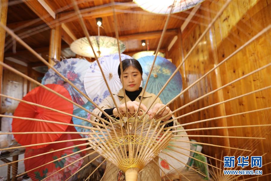 11月9日,在贵州省赤水市一家作坊里,一名工人在制作竹伞骨架。新华社发(王长育 摄)