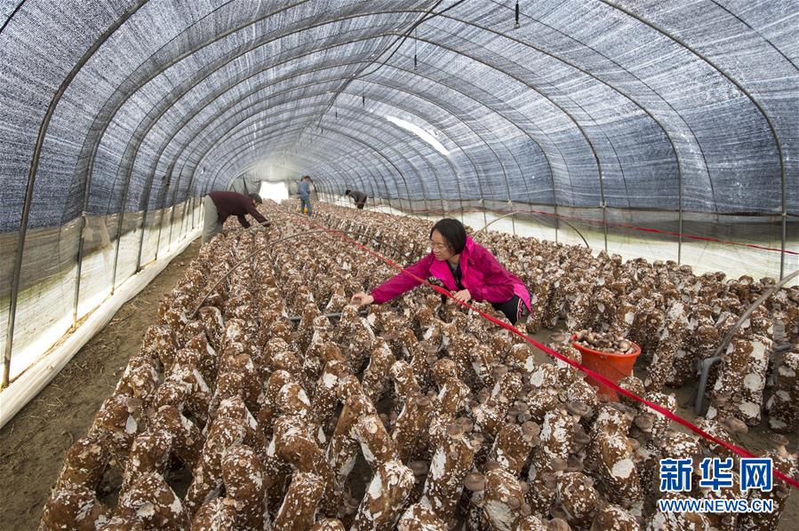 11月10日,在江苏省海安市角斜镇汤灶村,食用菌合作社菇农在采摘香菇。 新华社发(徐劲柏 摄)