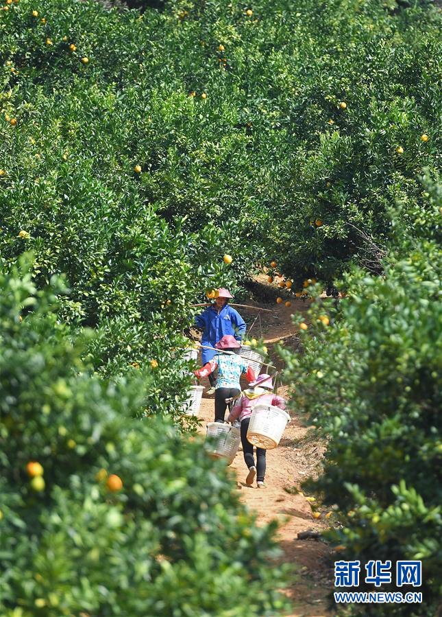 11月11日,江西省寻乌县澄江镇周田村的果农在挑运脐橙。 新华社记者 万象 摄