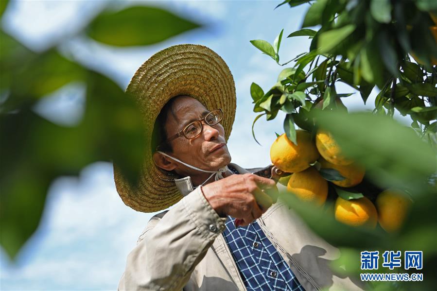江西省寻乌县晨光镇湖岽村的果农在采摘脐橙(11月10日摄)。 新华社记者 万象 摄