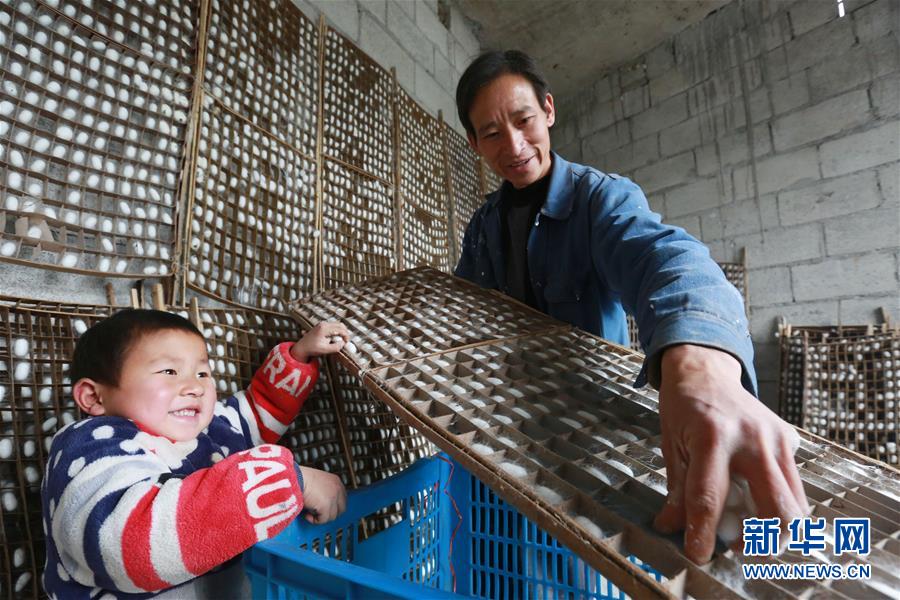 11月12日,在贵州省毕节市双山镇普陆村,杨天勇和儿子摘蚕茧。 新华社发(王纯亮 摄)