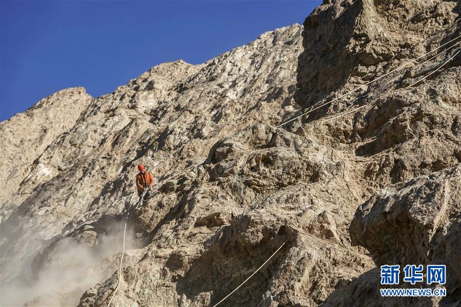 11月12日,在新疆塔什库尔干塔吉克自治县县城至大同乡道路的一处施工现场,工人刘全在峭壁上作业。 近日,一支由四川、云南等地工人组成的施工队忙碌在帕米尔高原深处的大山中,为塔什库尔干塔吉克自治县县城至大同乡道路的易落石路段安装防护网。崇山峻岭间,工人要攀爬至峭壁上施工作业,如跃动在大山间的“舞者”。据介绍,这支施工队常年活跃在新疆山区道路的施工现场,为风险路段加装安全防护装置,保障过往车辆和沿途村民出行安全。 新华社记者 胡虎虎 摄