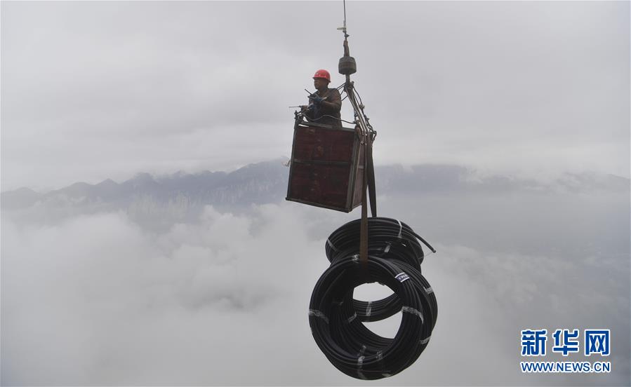11月13日,探水队队员通过铁吊篮运送水管到天宝洞内。