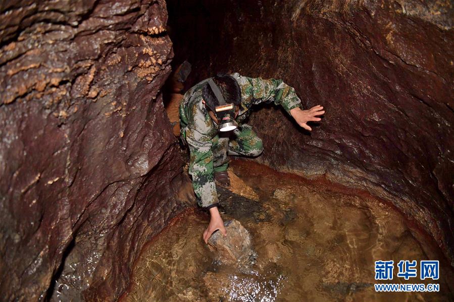 10月31日,探水队队员在天宝洞查看水源。 新华社发(杨顺丕 摄)
