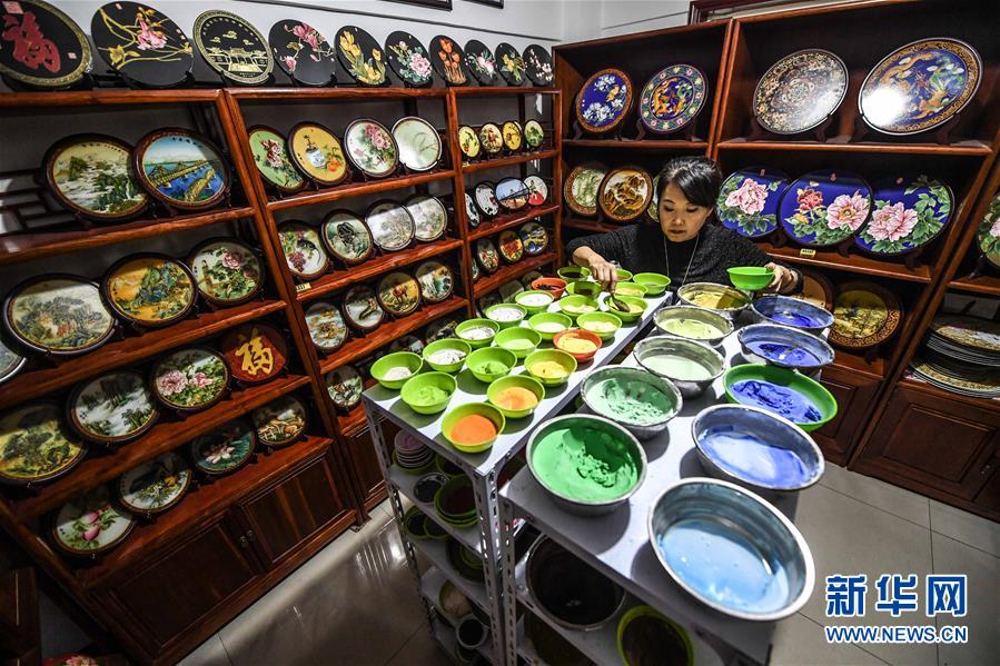 11月14日,刘晶涛配制制作景泰蓝珀晶画所用的颜料。 刘晶涛是生活在辽宁省丹东市凤城市的一名非遗传承人,她继承家族景泰蓝制作技艺,通过创新,将景泰蓝产品做成平面画作并装进画框,制作成景泰蓝珀晶画。据刘晶涛介绍,制作一幅景泰蓝珀晶画需要经过设计、制图、绘图、烘干、掐丝、点蓝、再烘干、磨砂、装裱、配框等十几道工序。 新华社记者 潘昱龙 摄