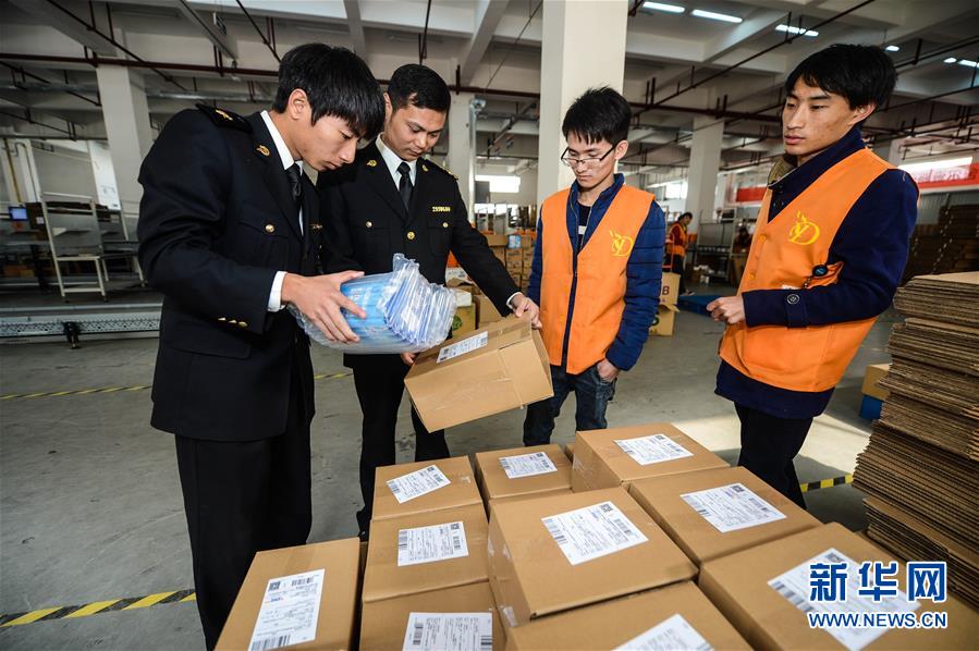 在浙江杭州跨境电子商务产业园的仓库里,杭州海关关员查验为迎接“双11”运抵园区的进口商品(2015年11月10日摄)。新华社记者 徐昱 摄