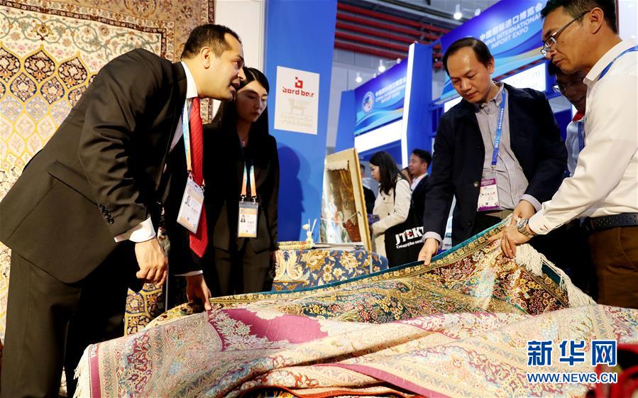 在首届进博会上,一位来自伊朗的展商(左)向参观者介绍波斯地毯(11月5日摄)。新华社记者 方喆 摄
