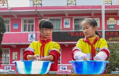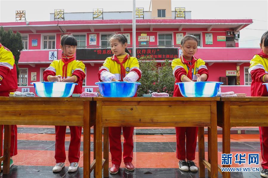 贵州省织金县以那小学的学生在文明如厕主题活动上示范如何洗手(10月24日摄)。11月19日是世界厕所日。从2006年起,教育部与联合国儿童基金会开始携手推动“学校水、环境卫生与个人卫生项目”,旨在为欠发达的中西部地区儿童提供安全饮用水、改善环境卫生设施并助其养成良好的个人卫生习惯。项目以五年为一个周期开展试点,第三个五年周期自2016年起开始,共选取贵州、云南、重庆、新疆、广西的6个县进行试点,其中贵州省织金县有50所小学被选为试点学校。2018年,其中的10所小学率先开始了学校“厕所革命”工作。新华社记者 张玉薇 摄