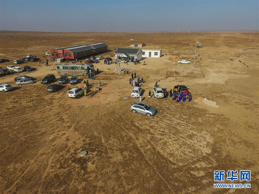 11月17日,在内蒙古鄂尔多斯市鄂托克前旗乌提嘎查,男方家属迎接乘车抵达的新娘(无人机航拍)。新华社记者 刘磊 摄
