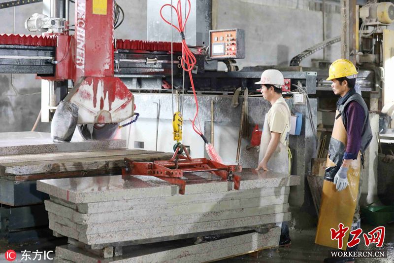 11月17日,工人在广西桂林市平乐县某石材加工企业生产车间作业。(图片来源:东方IC  请勿转载)