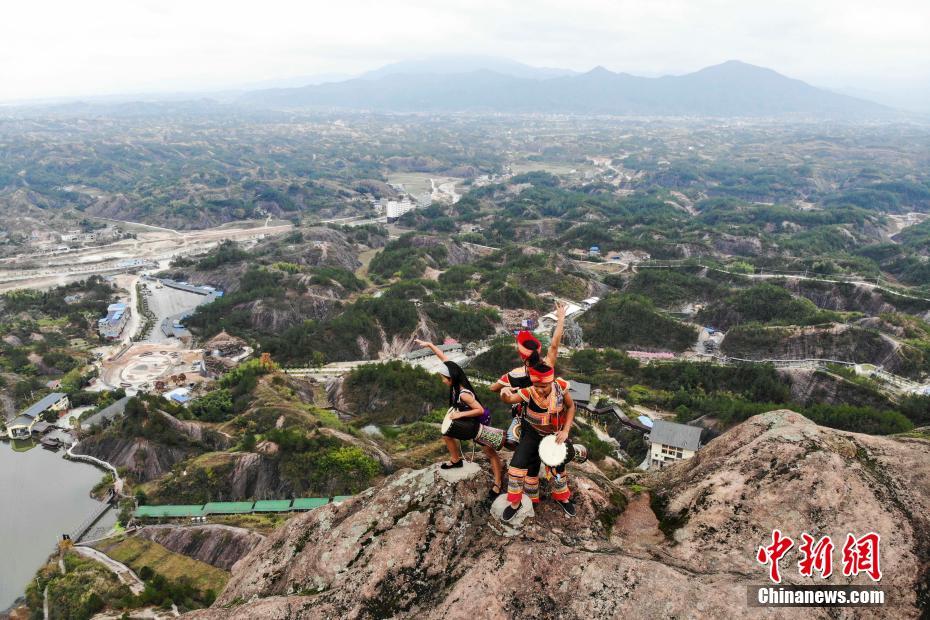 湖南平江悬崖之巅上演高空手鼓乐演奏