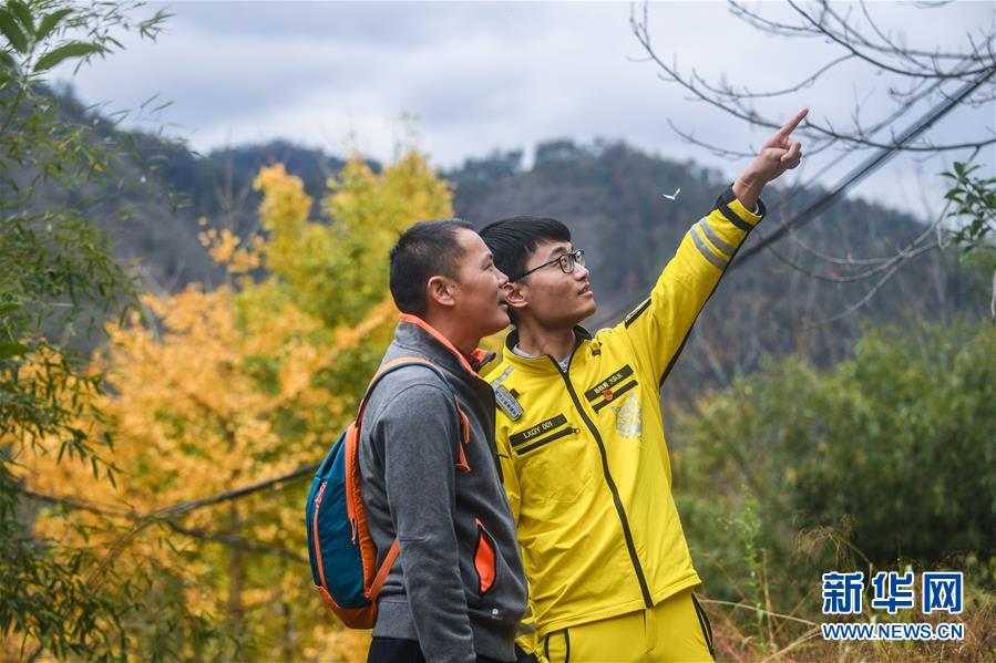 11月19日,清凉峰镇的党员公益救援队队员(右)在给一名徒步游览的游客指路。新华社记者 徐昱 摄
