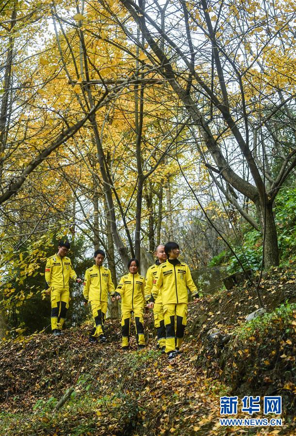 11月19日,清凉峰镇的党员公益救援队队员利用空余轮班时间,在附近的山道上进行日常巡逻。 新华社记者 徐昱 摄