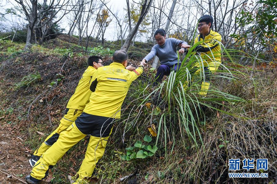 11月19日,清凉峰镇的党员公益救援队队员帮助一名偶遇的游客下山。 新华社记者 徐昱 摄