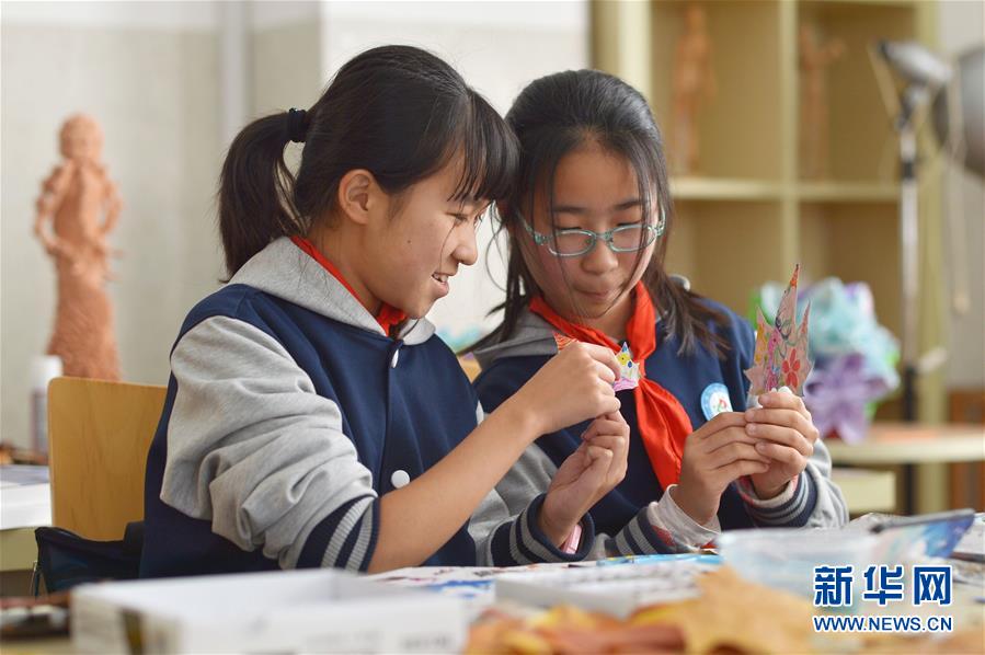 11月19日,山东省青岛市实验小学学生在创作树叶画。 新华社发(王海滨 摄)