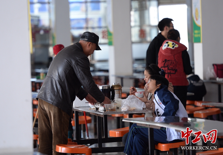 家长们把食物带到学校的食堂,陪孩子在学校吃饭。中工网记者 吴凡 摄