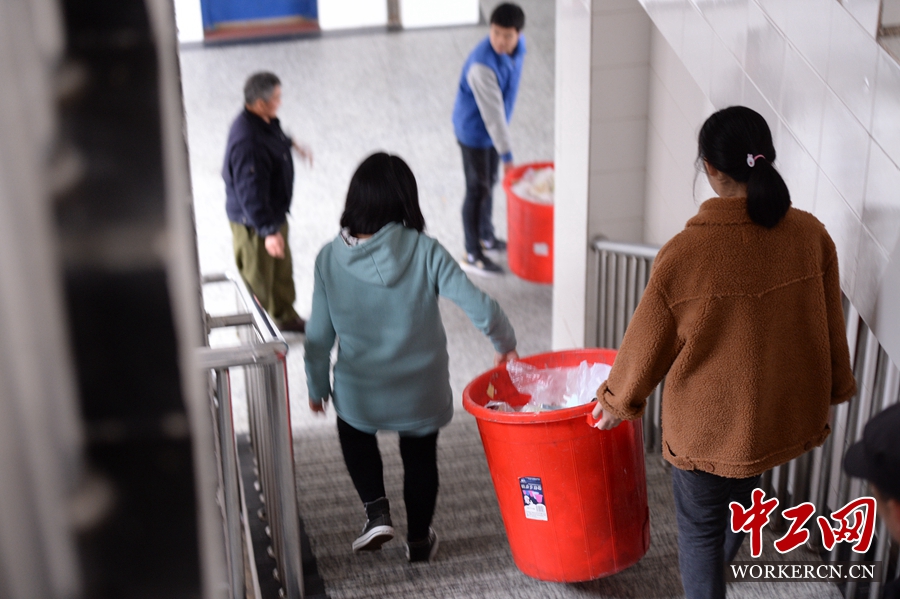 教学楼内,几位学生清理班级的垃圾。中工网记者 吴凡 摄