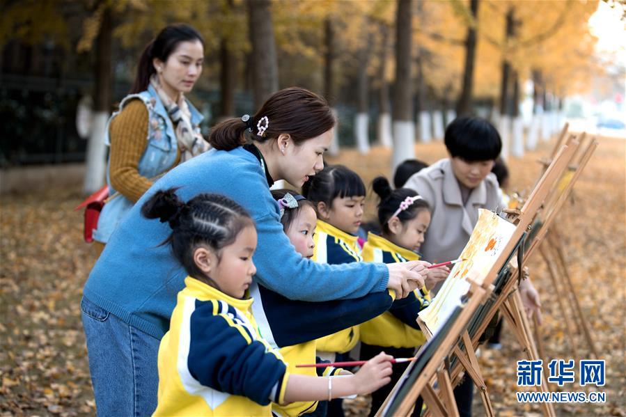 11月20日,浙江省长兴县张家村花园幼儿园的老师指导孩子在银杏林中绘画。 新华社发(许斌华 摄)